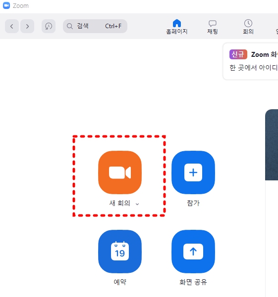 로그인 후 [새 회의] 주황색 아이콘을 눌러주면 화상회의를 시작 할 수 있습니다.